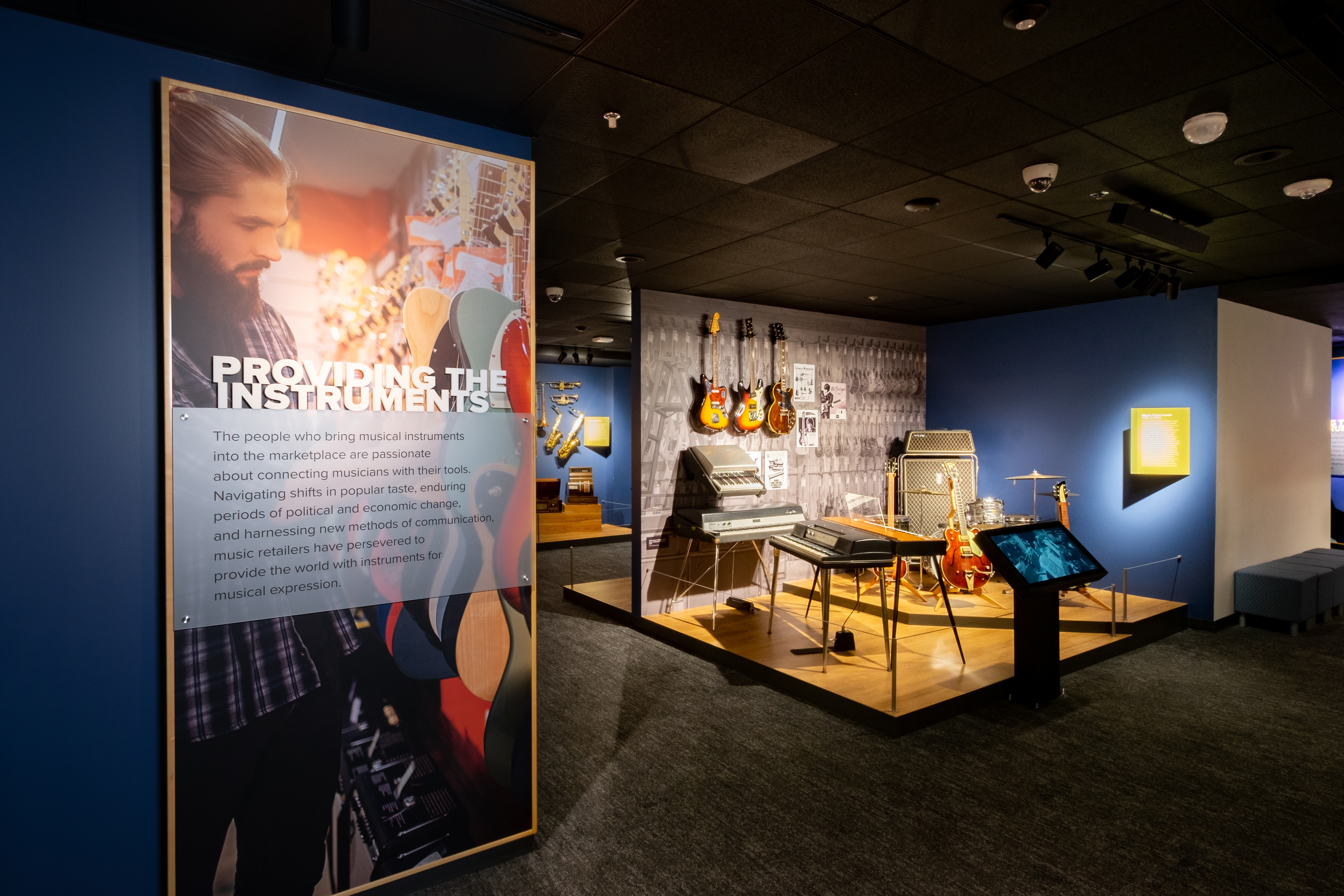 Setting: 19 distinct displays, 18 of which feature artifacts, primarily musical instruments, and one comprising printed panels with stories from the publishing sector of the industry. 15 touchscreen kiosks with directional speakers containing stories and accompanying images; audiovisual materials including musical excerpts, factory footage, and interviews from the NAMM Oral History program; and artifact information with high-resolution images.
