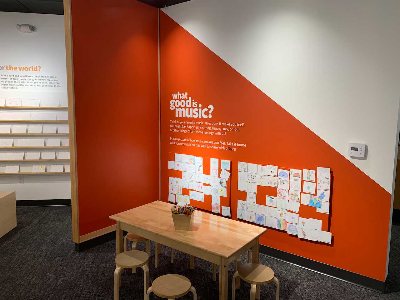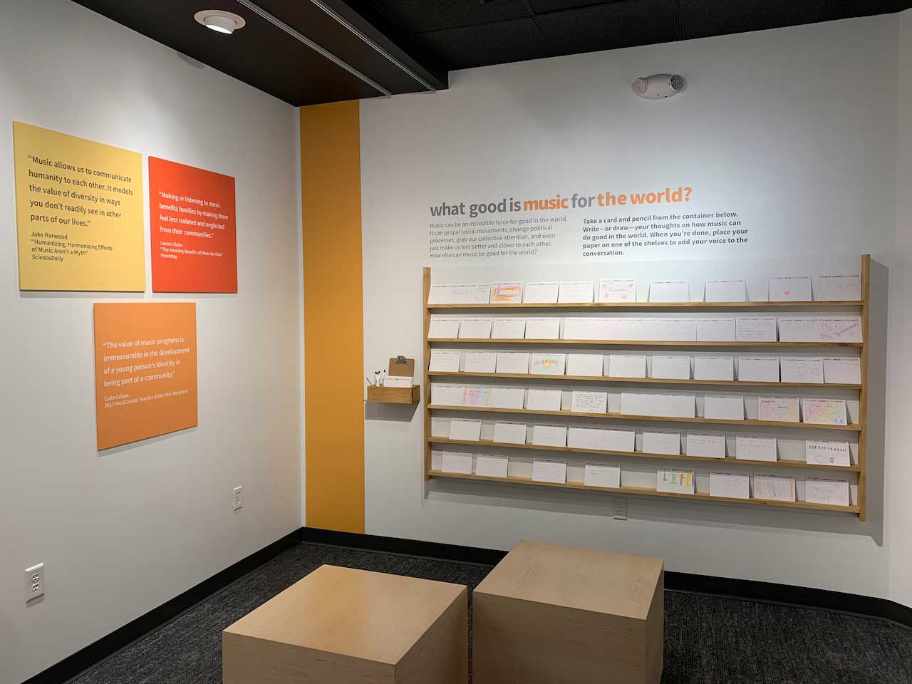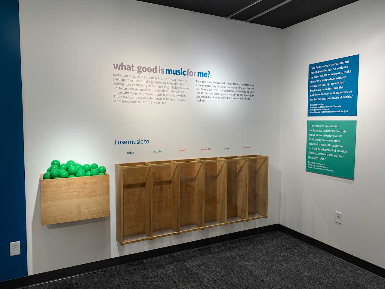 Setting: Each question is presented as an intuitive interactive opportunity: placing balls in buckets to indicate an answer, threading paracord around pegs to complete a statement, and writing a freeform response on supplied cards. A child-oriented area asks younger viistors to illustrate how music makes them feel with colored pencils on magnetic tiles that can be taken home or placed on a magnetic board to form a collage.