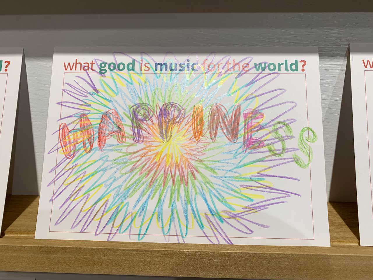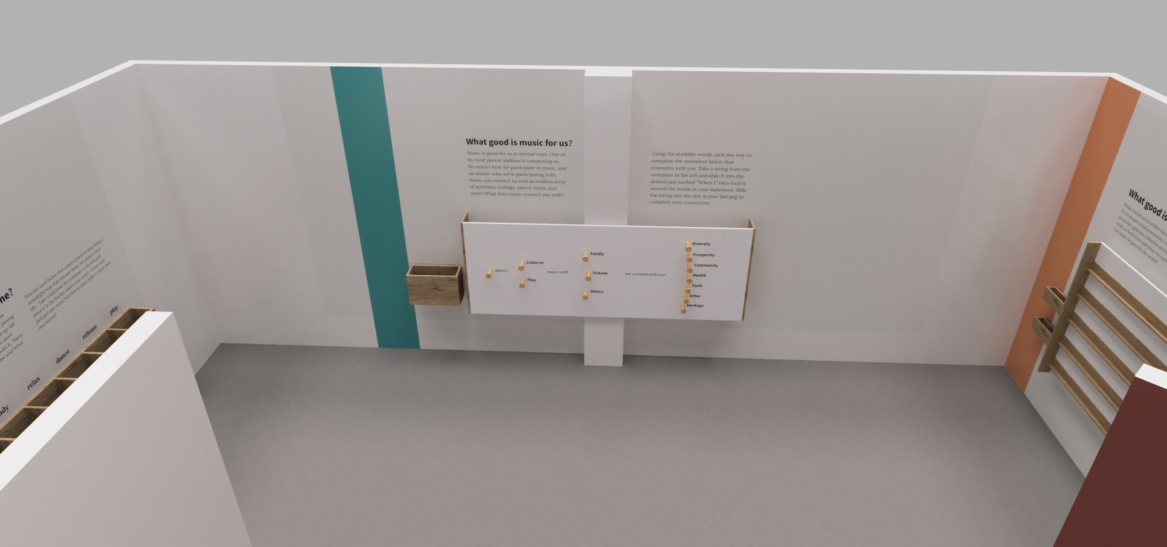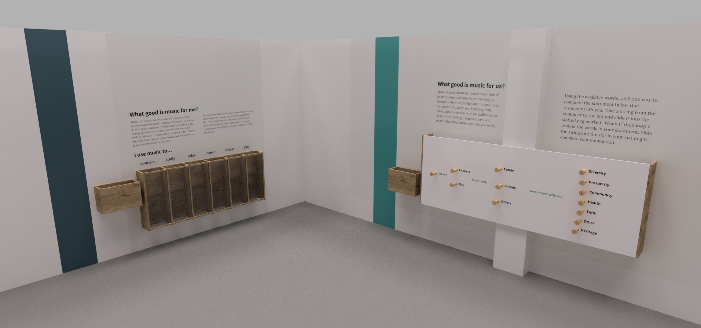 Setting: Each question is presented as an intuitive interactive opportunity: placing balls in buckets to indicate an answer, threading paracord around pegs to complete a statement, and writing a freeform response on supplied cards. A child-oriented area asks younger viistors to illustrate how music makes them feel with colored pencils on magnetic tiles that can be taken home or placed on a magnetic board to form a collage.