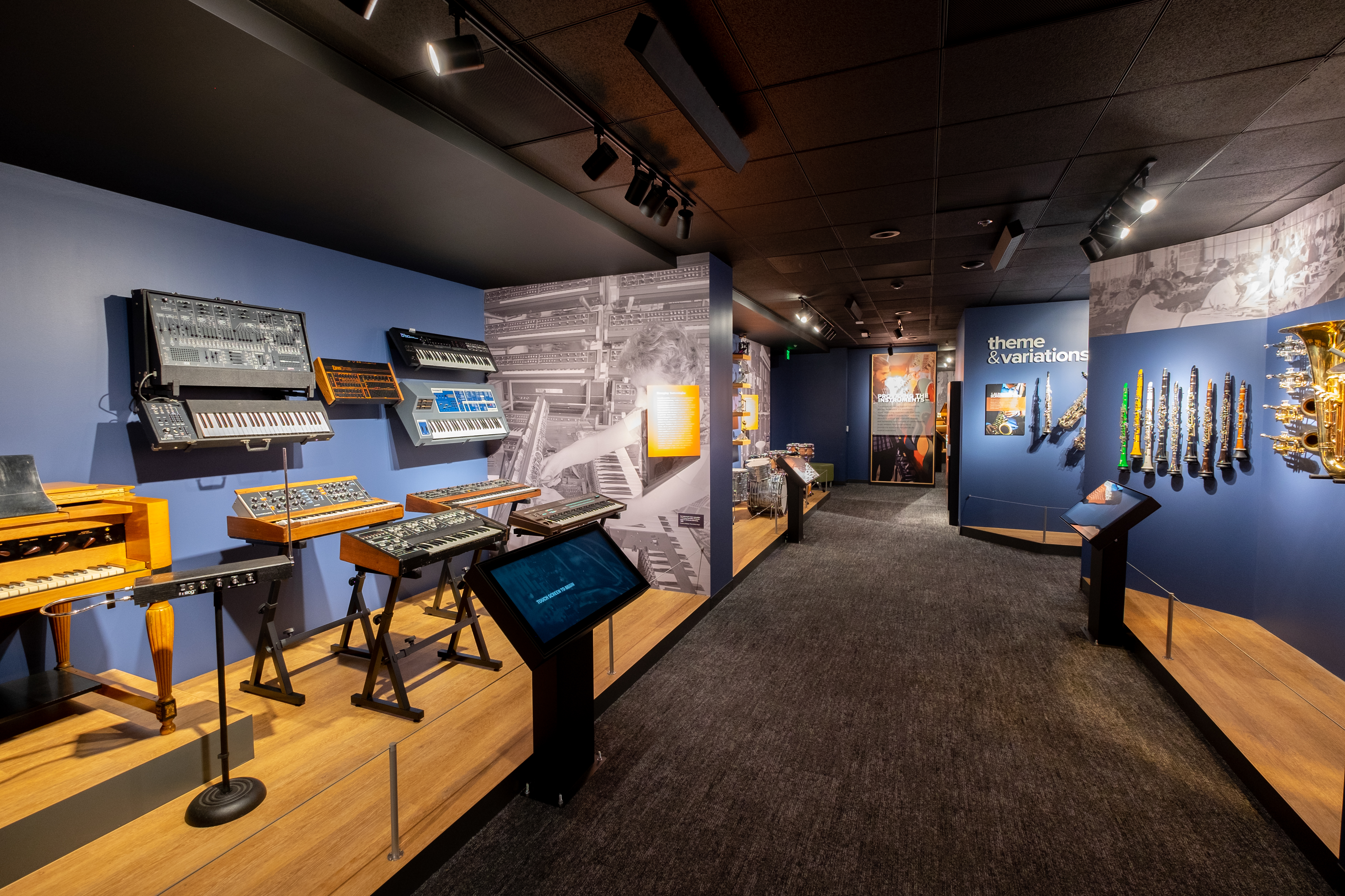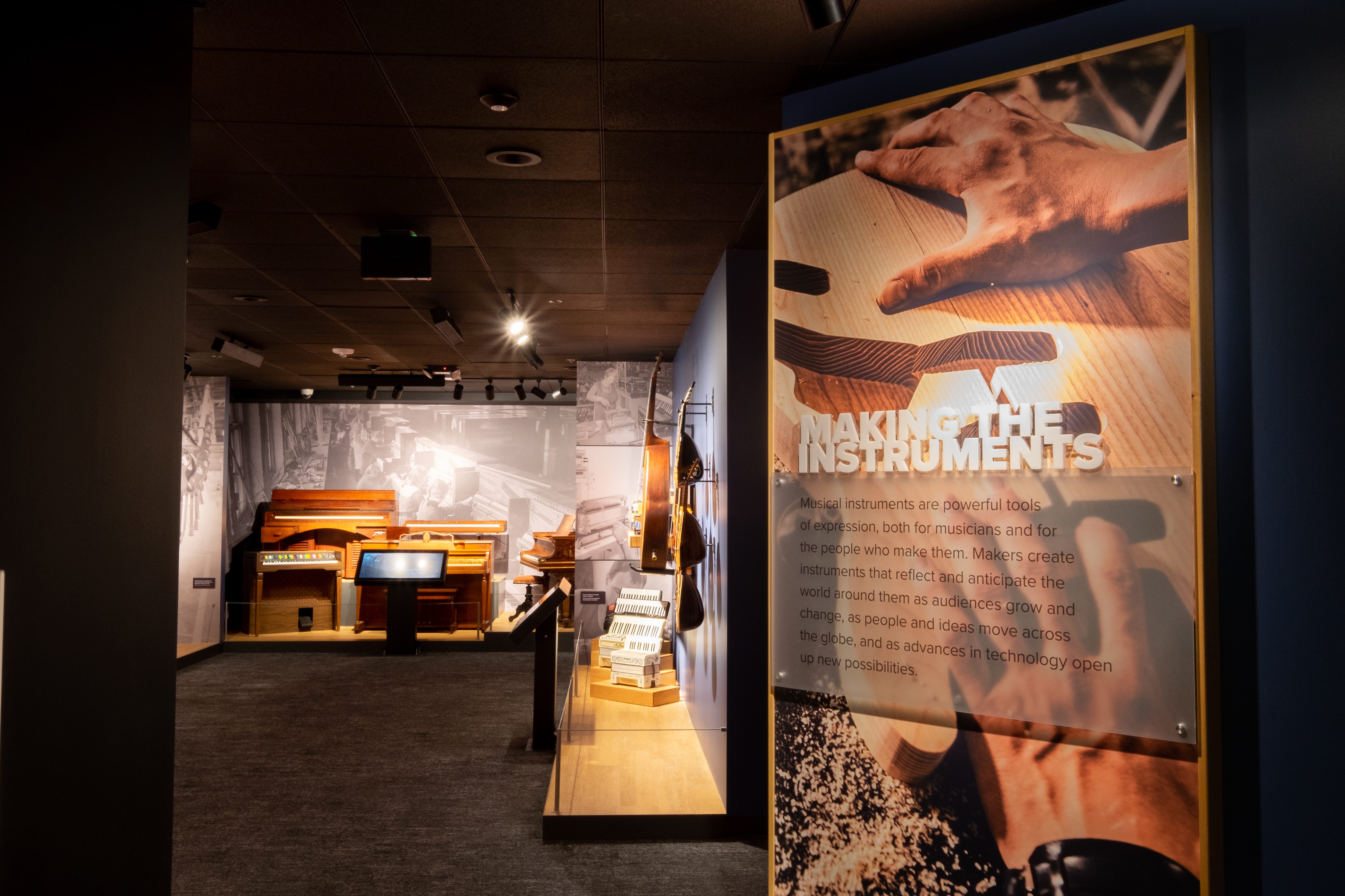 Content: Completely rewritten storylines centered around the “industry ecosystem” of ”make, sell, use.” The first gallery, ”Making the Instruments,” presents stories about the drivers of change affecting instrument development, such as the need for musicians to be heard among larger ensembles, the movement of peoples across the globe, the rise and fall of popular music styles, and more. The second gallery, ”Providing the Instruments,” explores social, economic, and cultural factors impacting the industry and its retail operations during five distinct historical periods. The third gallery, ”Using the Instruments,” features a wall-to-wall video presentation about the emotional power of music. The fourth gallery, ”Beyond the Instruments,” presents four stories about the cultural impact of instruments and their abilities to function as something more than tools for producing sound.