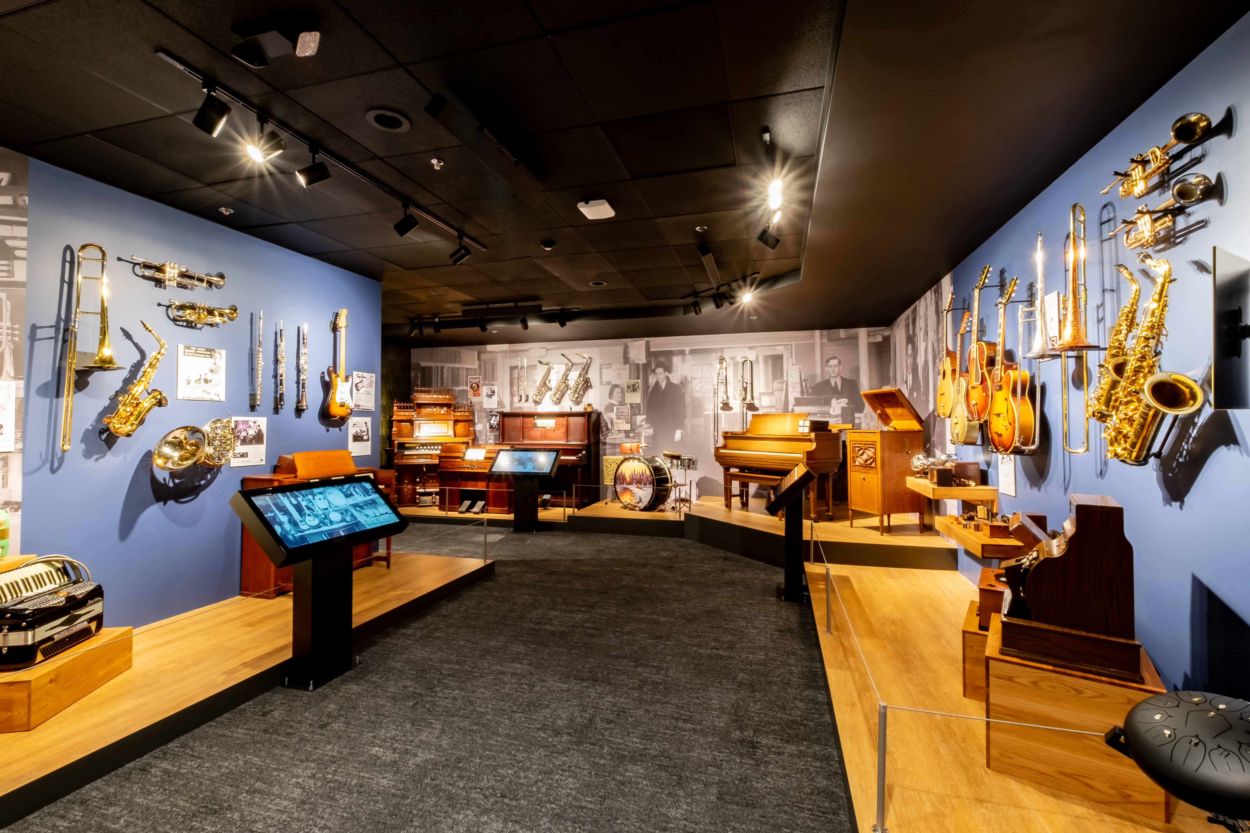 Setting: 19 distinct displays, 18 of which feature artifacts, primarily musical instruments, and one comprising printed panels with stories from the publishing sector of the industry. 15 touchscreen kiosks with directional speakers containing stories and accompanying images; audiovisual materials including musical excerpts, factory footage, and interviews from the NAMM Oral History program; and artifact information with high-resolution images.