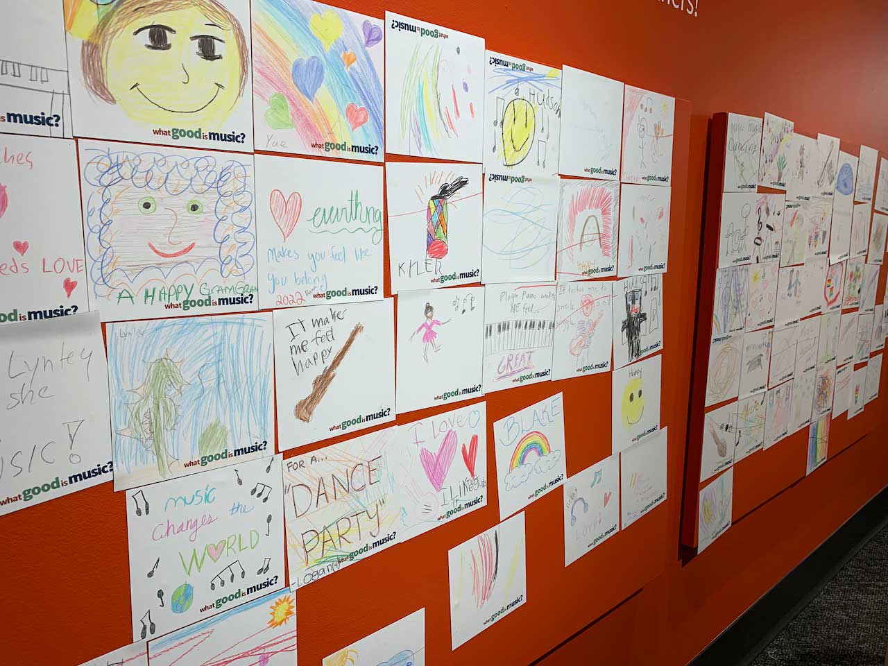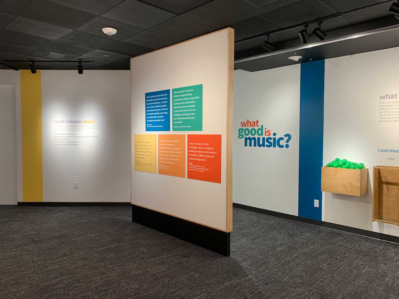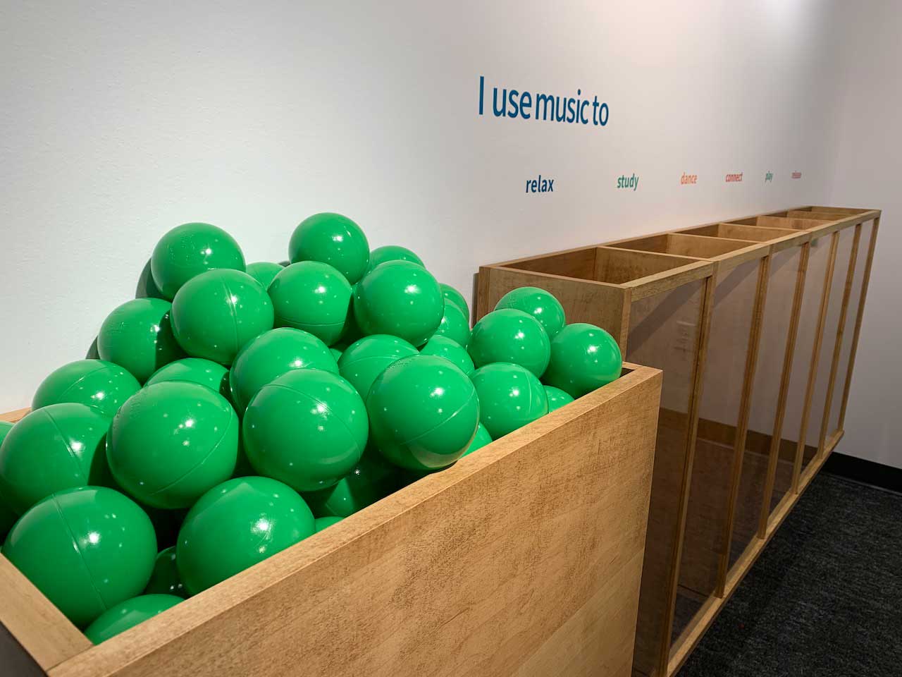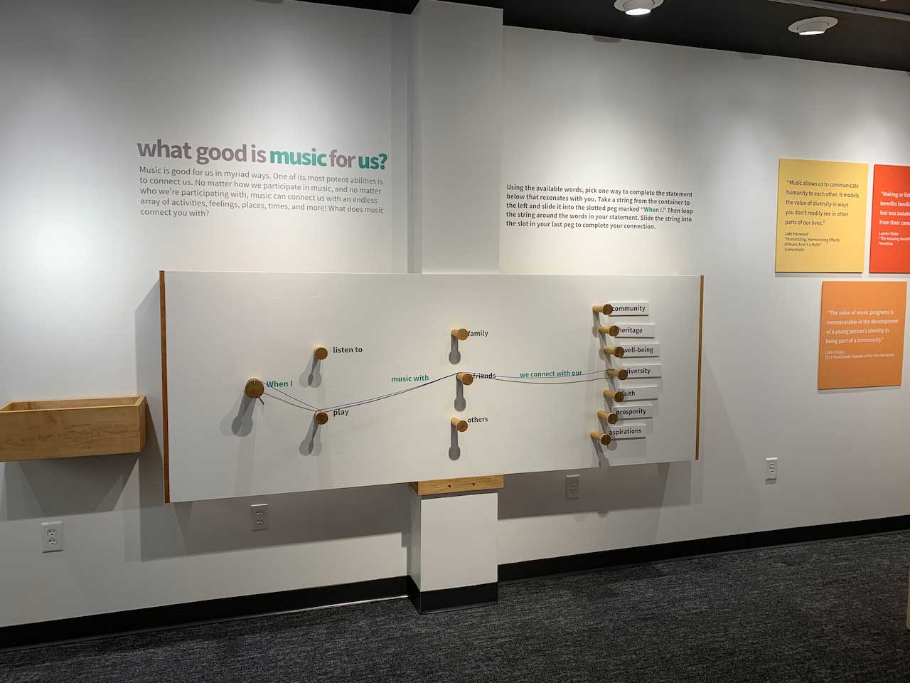 Setting: Each question is presented as an intuitive interactive opportunity: placing balls in buckets to indicate an answer, threading paracord around pegs to complete a statement, and writing a freeform response on supplied cards. A child-oriented area asks younger viistors to illustrate how music makes them feel with colored pencils on magnetic tiles that can be taken home or placed on a magnetic board to form a collage.