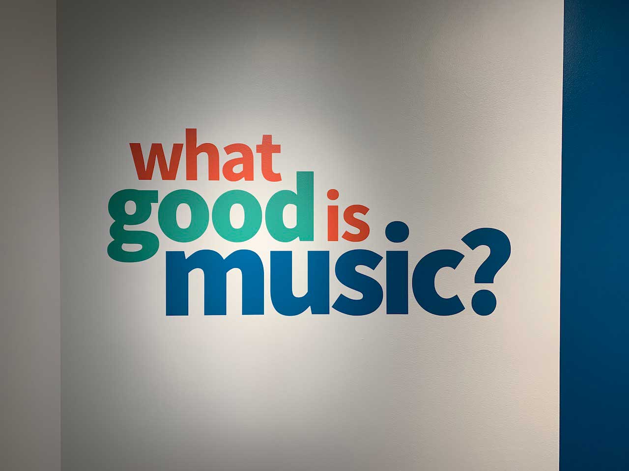 Content: Three primary questions: “What good is music for me?”, “What good is music for us?”, and “What good is music for the world?“. Each question is accompanied by a contextualizing statment, e.g. about how music can be used in daily life for positive outcomes or how music can connect groups of people with external activities or sentiments.