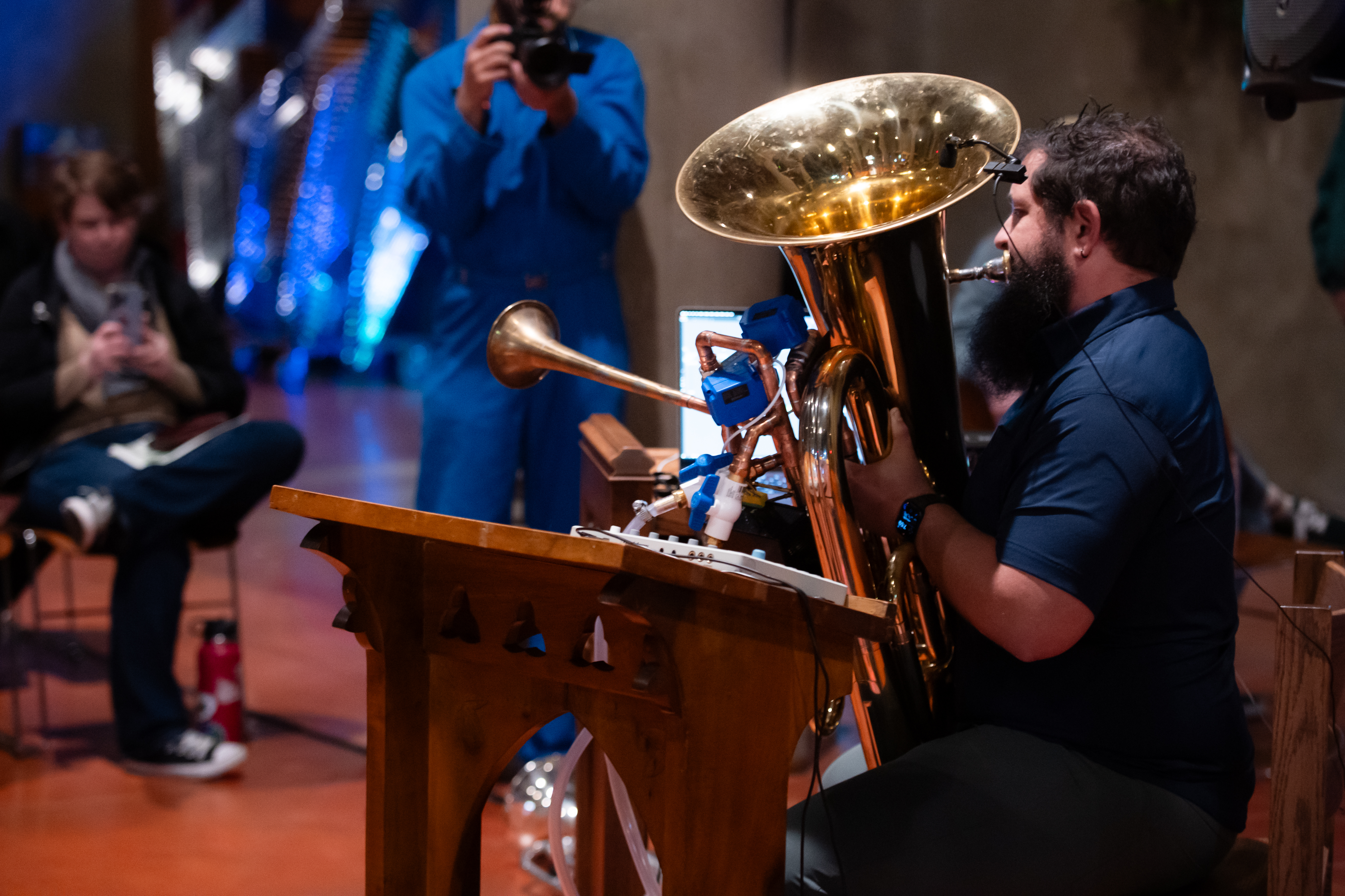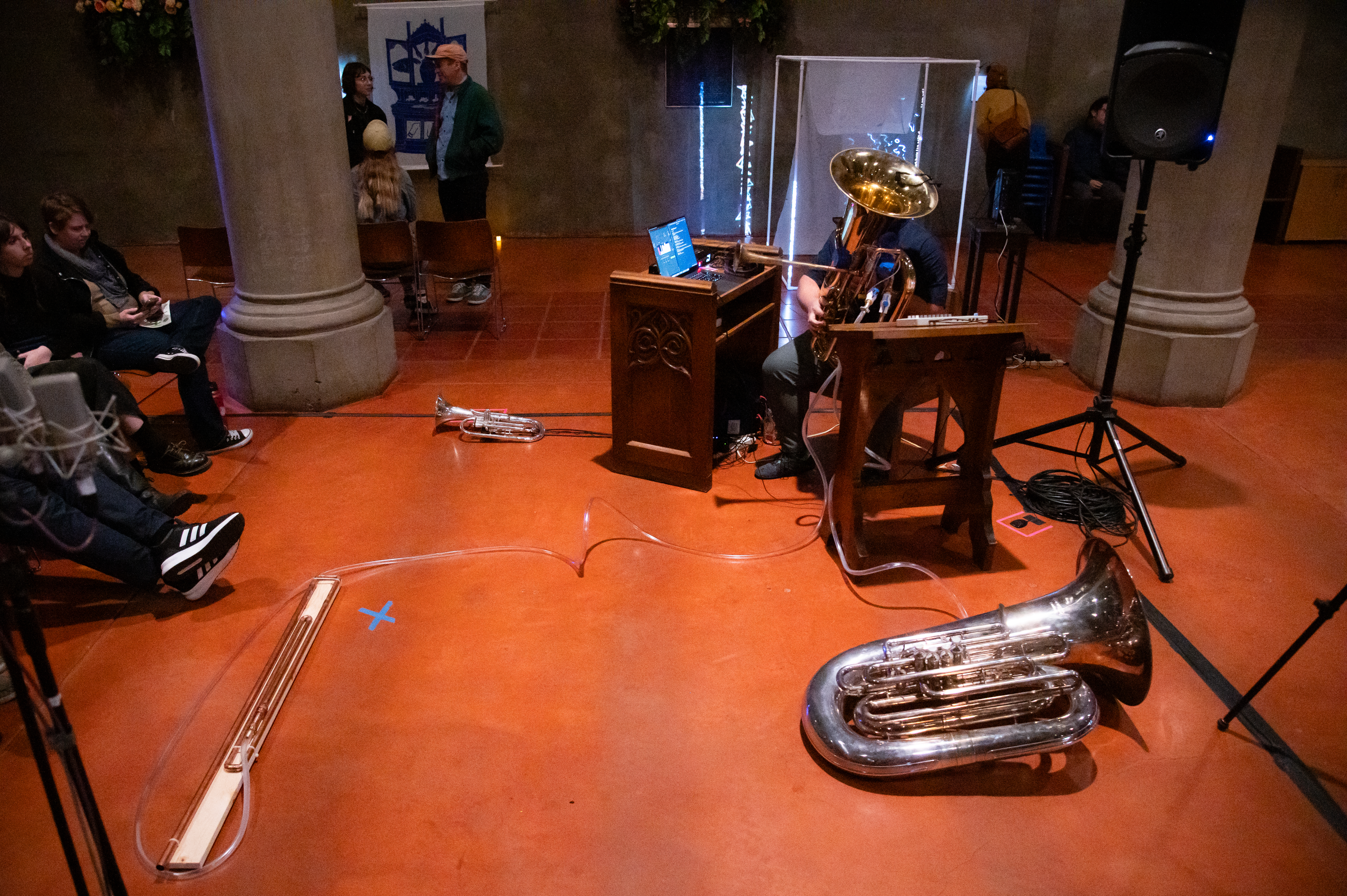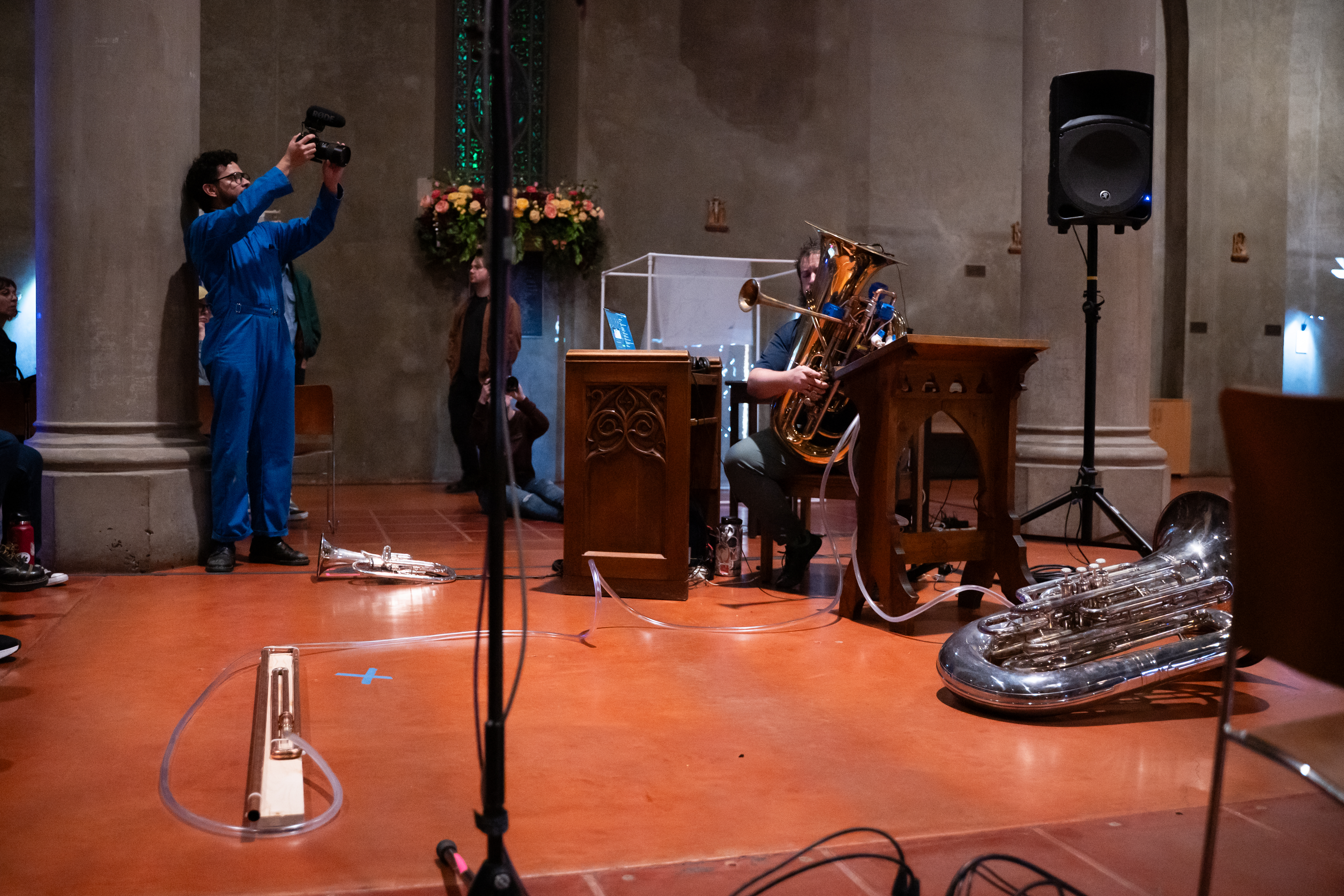 The piece then presents an overabundance of production: a tuba modified with a second bell and valves to divert air elsewhere, namely a second tuba and a custom reed-based resonator. The tubas play series of notes reminiscent of birdsong and plainchant, alternating and building in intensity to prove their worth in the eyes of their Creator.